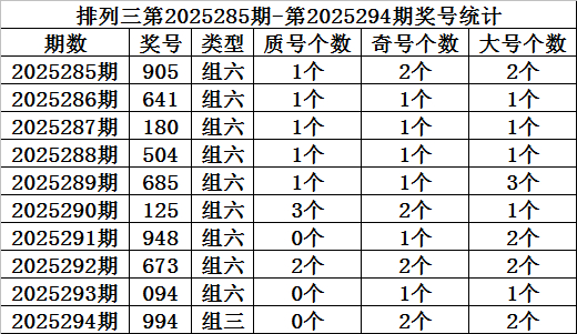 上期回来:成列三第2025294期开奖:994,质合比为0:3,奇偶比为2:1,大小比为2:1。
