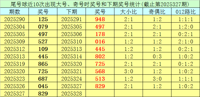 在尾号球前10次开出大号、奇号类型之后,其下期分离开出奖号:948、497、178、016、445、802、725、568、513、829,其中号码012路比为3:1:6,奇偶比为5:5,大小比为8:2。