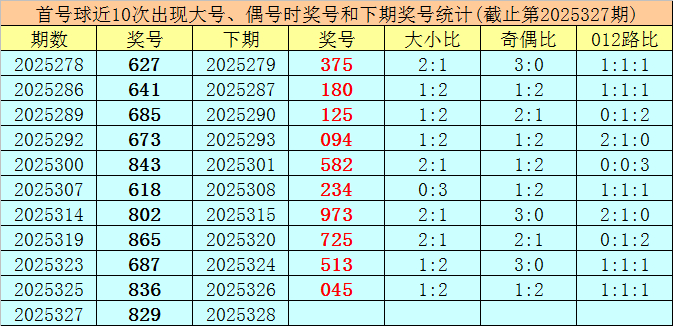在首号球前10次开出大号、偶号类型之后,其下期分离开出奖号:375、180、125、094、582、234、973、725、513、045,其中号码奇偶比为7:3,大小比为4:6,012路比为4:3:3。