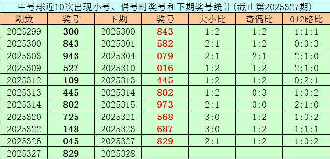 中号球:上期奖号为2,开出小 号、偶号,该位前10次开出小 号、偶号的讲理时其奖号分离为:300、843、943、527、109、445、802、725、148、045,其中中号球012路比为3:5:2。